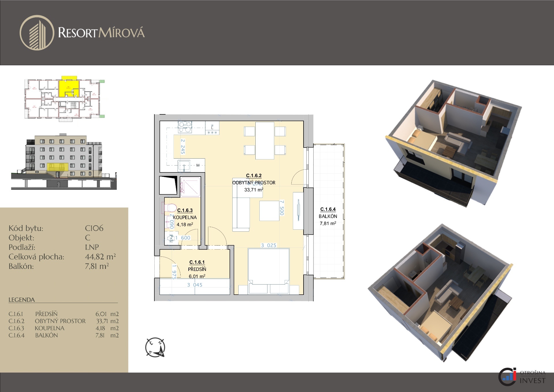 Nabízíme vám k prodeji bytovou jednotku o dispozici 1+kk o velikosti 43,9 m2 + balkón o velikosti 7,81 m2 v novostavbě projektu Resort Mírová. Tato bytová jednotka se bude nacházet v 1.NP a bude situována na severozápad. Dispozice bytu: vstupní chodba se vstupem do koupelny s toaletou a obývacího pokoje s kuchyňským koutem, ze kterého je vstup na balkón. Byt lze upravit na dispozici 2+kk. Bytová jednotka bude vybavená vinylovou podlahou, keramickými obklady a dlažbou v koupelně, interiérovými dveřmi s obložkami a sanitou. Součástí bytu není kuchyňská linka. Kupující si bude vybírat ze 6 odstínů vinylové podlahy, obkladů, dlažeb a interiérových dveří s obložkou. Standardem je bezbariérový přístup a moderní výtah. Koupě bytu je podmíněná koupí alespoň jednoho garážového stání a sklepní kóje. Cena bytu je uvedená bez ceny garážového stání a sklepní kóje. Koupi bytu v Resortu Mírová nabízí také velmi zajímavou investiční příležitost, jelikož se v okolí nachází provozovny velkých společností, jako např. Škoda auto, FAB, Bednar FMT, Sika CZ, Seko tool a další. Resort Mírová bude realizován v jihovýchodním cípu města a v jeho těsné blízkosti najdete veškerou občanskou vybavenost: školky, školy, obchody, restaurace atd. Bytová jednotka bude v osobním vlastnictví a její koupi lze financovat hypotečním úvěrem, který vám v rámci našich služeb zařídíme za nejvýhodnějších podmínek na trhu a bez poplatků. Pro více informací a domluvení osobní schůzky nás neváhejte kontaktovat.