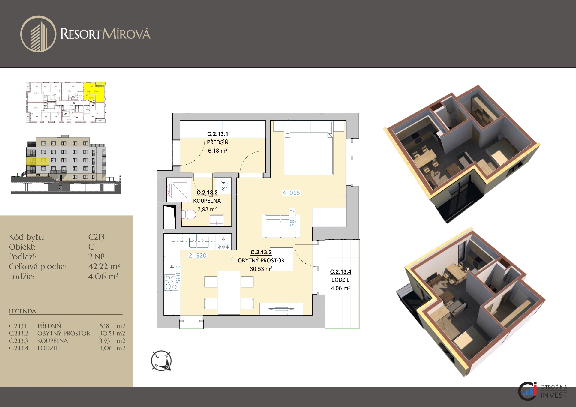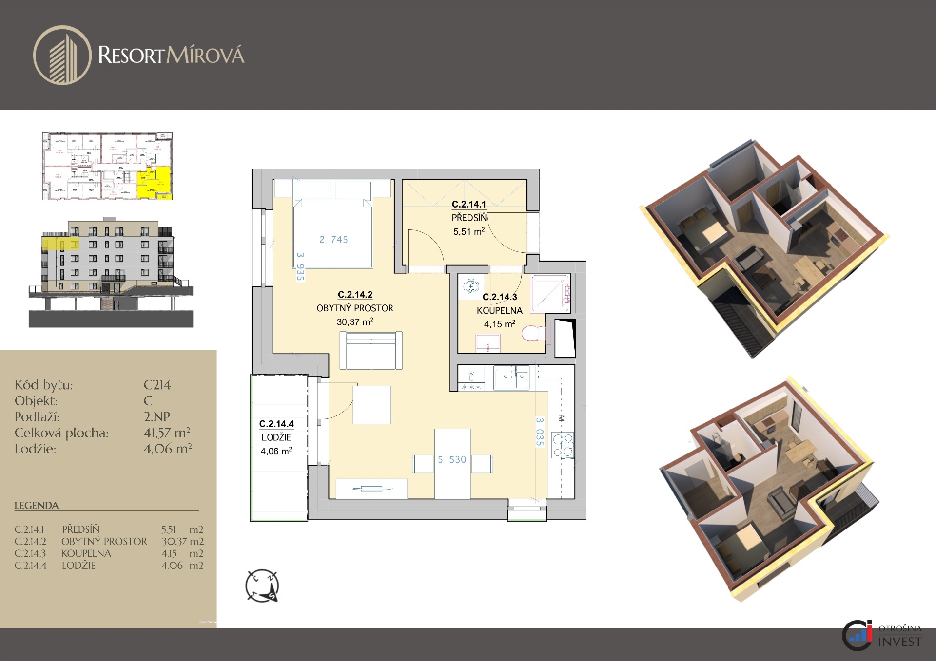 Nabízíme vám k prodeji bytové jednotky o dispozici 2+kk o velikosti 40,64 m2 + lodžie o velikosti 4,06 m2 v novostavbě projektu Resort Mírová. Tyto bytové jednotky se budou nacházet ve 2. a 3.NP a budou situovány na severozápad/severovýchod anebo na severovýchod/jihovýchod. Dispozice bytu: vstupní chodba se vstupem do koupelny s toaletou a obývacího pokoje s kuchyňským koutem, ze kterého je vstup na lodžii. Bytové jednotky budou vybaveny vinylovou podlahou, keramickými obklady a dlažbou v koupelně, interiérovými dveřmi s obložkami a sanitou. Součástí bytu není kuchyňská linka. Kupující si bude vybírat ze 6 odstínů vinylové podlahy, obkladů, dlažeb a interiérových dveří s obložkou. Standardem je bezbariérový přístup a moderní výtah. Koupě bytu je podmíněná koupí alespoň jednoho garážového stání a sklepní kóje. Cena bytu je uvedená bez ceny garážového stání a sklepní kóje. Koupi bytu v Resortu Mírová nabízí také velmi zajímavou investiční příležitost, jelikož se v okolí nachází provozovny velkých společností, jako např. Škoda auto, FAB, Bednar FMT, Sika CZ, Seko tool a další. Resort Mírová bude realizován v jihovýchodním cípu města a v jeho těsné blízkosti najdete veškerou občanskou vybavenost: školky, školy, obchody, restaurace atd. Bytová jednotka bude v osobním vlastnictví a její koupi lze financovat hypotečním úvěrem, který vám v rámci našich služeb zařídíme za nejvyhodněyších podmínek na trhu a bez poplatků. Pro více informací a domluvení osobní schůzky nás neváhejte kontaktovat.