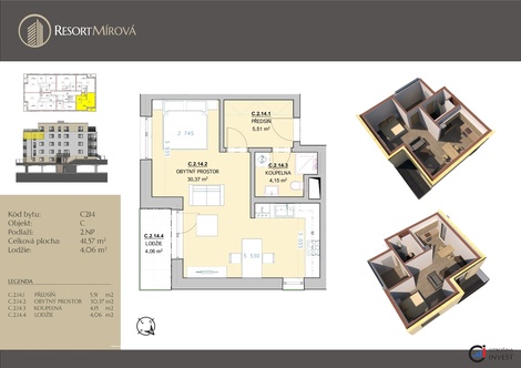 Nabízíme vám k prodeji bytovou jednotku o dispozici 2+kk o velikosti 38,10 m2 + předzahrádka o velikosti 27,02 m2 v novostavbě projektu Resort Mírová…