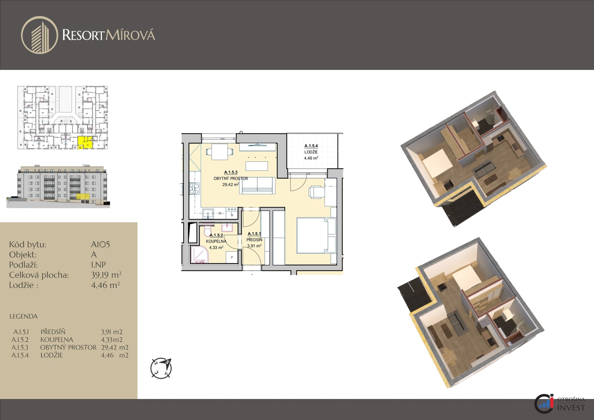 Nabízíme vám k prodeji bytovou jednotku o dispozici 1+kk o velikosti 39,19 m2 + lodžie o velikosti 4,46 m2 v novostavbě projektu Resort Mírová. Tato bytová jednotka se bude nacházet v 1.nadzemním podlaží a bude situována na západ. Dispozice bytu: vstupní chodba se vstupem do koupelny s toaletou a obývacího pokoje s kuchyňským koutem, ze kterého je vstup na lodžii. Byt lze upravit na dispozici 2+kk. Bytová jednotka bude vybavená vinylovou podlahou, keramickými obklady a dlažbou v koupelně, interiérovými dveřmi s obložkami a sanitou. Součástí bytu není kuchyňská linka. Kupující si bude vybírat ze 6 odstínů vinylové podlahy, obkladů, dlažeb a interiérových dveří s obložkou. Standardem je bezbariérový přístup a moderní výtah. Koupě bytu je podmíněná koupí alespoň jednoho garážového stání a sklepní kóje. Cena bytu je uvedená bez ceny garážového stání a sklepní kóje. Koupi bytu v Resortu Mírová nabízí také velmi zajímavou investiční příležitost, jelikož se v okolí nachází provozovny velkých společností, jako např. Škoda auto, FAB, Bednar FMT, Sika CZ, Seko tool a další. Resort Mírová bude realizován v jihovýchodním cípu města a v jeho těsné blízkosti najdete veškerou občanskou vybavenost: školky, školy, obchody, restaurace atd. Bytová jednotka bude v osobním vlastnictví a její koupi lze financovat hypotečním úvěrem, který vám v rámci našich služeb zařídíme za nejvýhodnějších podmínek na trhu a bez poplatků. Pro více informací a domluvení osobní schůzky nás neváhejte kontaktovat.