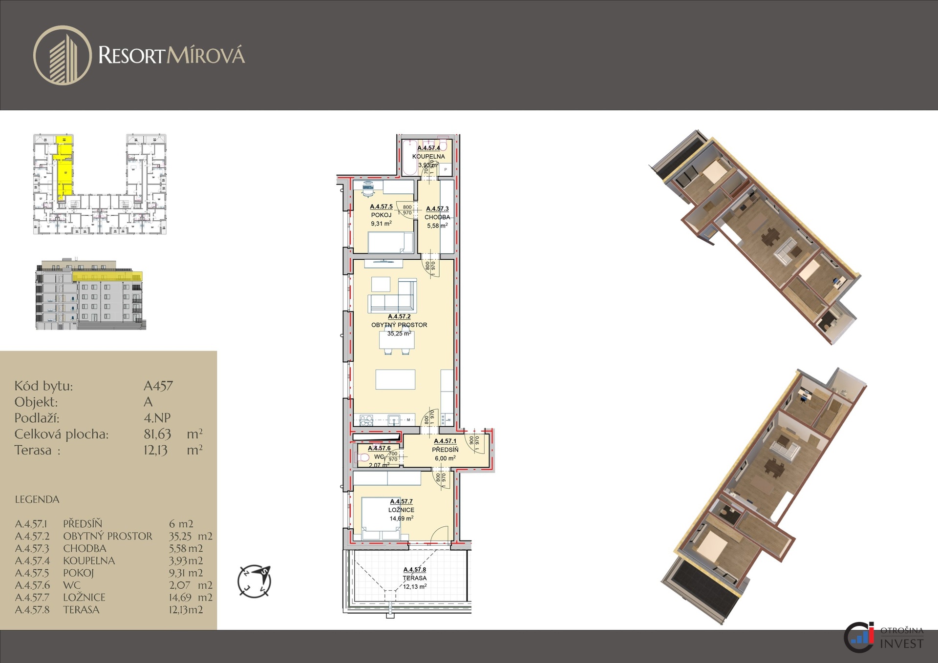Nabízíme vám k prodeji bytovou jednotku o dispozici 3+kk o velikosti 81,63 m2 + terasa o velikosti 12,13 m2 v novostavbě projektu Resort Mírová. Tato bytová jednotka se bude nacházet v 4.nadzemním podlaží a bude situována na severovýchod. Dispozice bytu: vstupní chodba se vstupem do samostatné toalety, ložnice a obývacího pokoje s kuchyňským koutem. Z obývacího pokoje je vstup do chodby, která dále vede do druhého samostatného pokoje a koupelny. Dveře na terasu se nacházejí v ložnici. Bytová jednotka bude vybavená vinylovou podlahou, keramickými obklady a dlažbou v koupelně, interiérovými dveřmi s obložkami a sanitou. Součástí bytu není kuchyňská linka. Kupující si bude vybírat ze 6 odstínů vinylové podlahy, obkladů, dlažeb a interiérových dveří s obložkou. Standardem je bezbariérový přístup a moderní výtah. Koupě bytu je podmíněná koupí alespoň jednoho garážového stání a sklepní kóje. Cena bytu je uvedená bez ceny garážového stání a sklepní kóje. Koupi bytu v Resortu Mírová nabízí také velmi zajímavou investiční příležitost, jelikož se v okolí nachází provozovny velkých společností, jako např. Škoda auto, FAB, Bednar FMT, Sika CZ, Seko tool a další. Resort Mírová bude realizován v jihovýchodním cípu města a v jeho těsné blízkosti najdete veškerou občanskou vybavenost: školky, školy, obchody, restaurace atd. Bytová jednotka bude v osobním vlastnictví a její koupi lze financovat hypotečním úvěrem, který vám v rámci našich služeb zařídíme za nejvýhodnějších podmínek na trhu a bez poplatků. Pro více informací a domluvení osobní schůzky nás neváhejte kontaktovat.