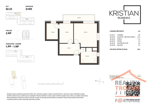V novém developerském projektu Rezidence Kristian nabízíme prodej, moderního a nízkoenergetického bydlení v bytu 2+kk s balkónem ve vyhledávané lokalitě v Hradci Králové - Moravské Předměstí. Bytová jednotka se nachází ve 2. NP zděného bytového domu, celková užitná plocha 66 m2, balkón - 7,6 m2, šatna 7,5 m2. K bytu náleží 1x vnitřní parkovací stání. Dispozice: vstupní chodba, obývací pokoj s kuchyňským koutem, ložnice, šatna, koupelna s WC. Vytápění: ústřední dálkové. Ve standardním provedení: plastová okna hranatá s izolačním trojsklem, vinylové podlahy KPP - výběr z 12 typů dekorů, koupelna s keramickou dlažbou La Ceramica Factory - výběr ze 4 dekorů, obklady Rako Systém, umyvadlo keramické se stojánkovou pákovou baterií, vana bílá akrylátová obdélníková. WC závěsné bílé. Použité materiály kombinují moderní technologie a udržitelnost a především snižují energetické náklady. Bytová jednotka se nachází na Moravském Předměstí v novostavbě bytového domu v Rezidenci Kristian. Výhodou lokality je veškerá občanská vybavenost v místě a výborná dopravní dostupnost. Pěkné, klidné bydlení pro rodinu s dětmi. Parkování je zajištěno v podzemních garážích a venkovních parkovištích přímo v rezidenci. Bližší informace Vám rádi sdělíme v realitní kanceláři. Máme pro Vás připraveny informace k hypotečnímu úvěru, který vyřídíme podle Vašich požadavků.