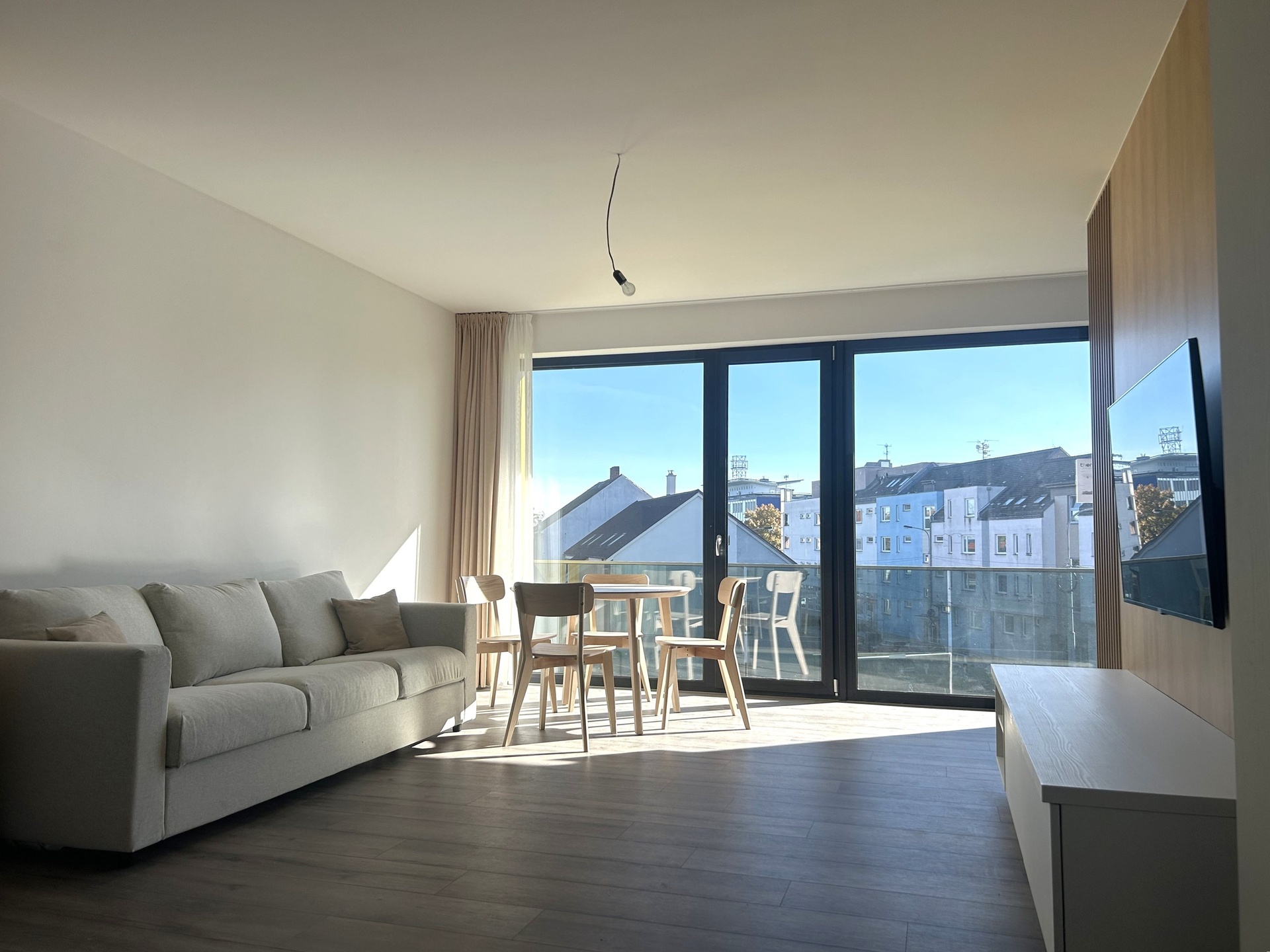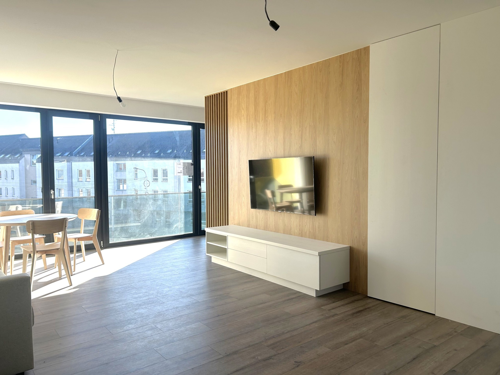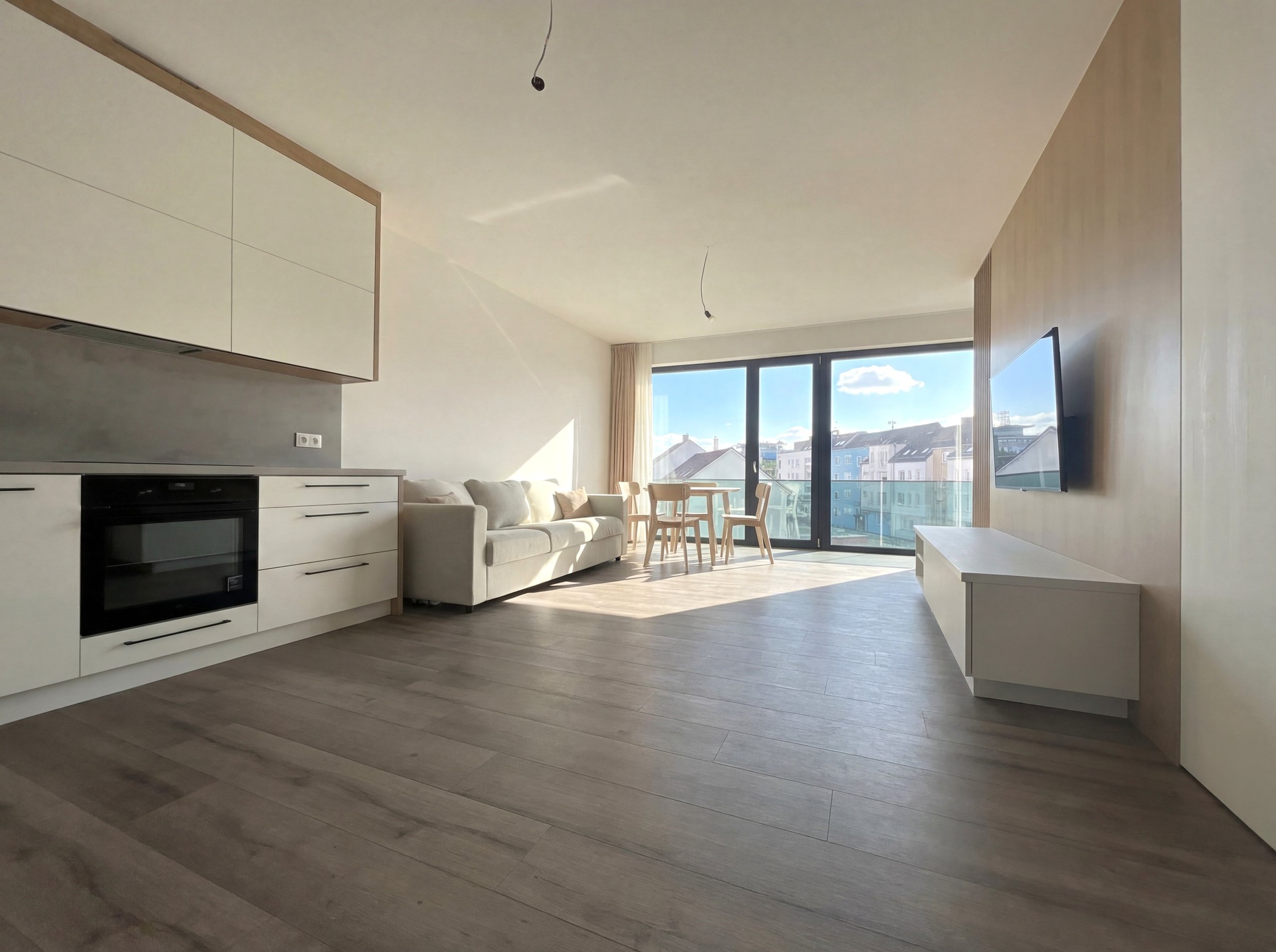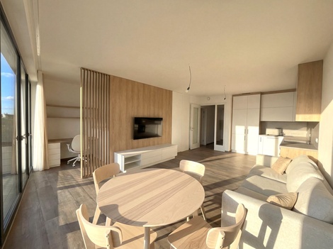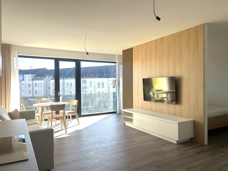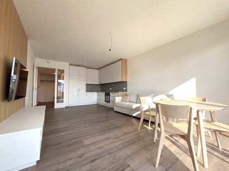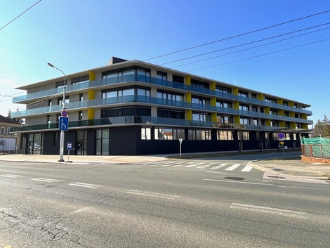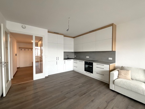 Nabízíme vám k pronájmu zcela nový, dosud neužívaný a plně vybavený byt o dispozici 1+kk s balkonem v dokončeném projektu Rezidence Thera, který se nachází na rohu Pražské třídy a Pálenecké ulice. Byt o celkové výměře 59,85 m2 + balkon 7,7 m2 je situován ve 3. nadzemním podlaží a nabízí komfortní bydlení pro pár či jednotlivce. Byt disponuje prostorným pokojem, který je rozdělen designovou příčkou na obývací část s kuchyňským koutem, ložnici a pracovnu. Moderní kuchyňská linka je vyrobena na míru a je vybavena vestavěnými spotřebiči. Součástí bytu je koupelna s WC a sprchovým koutem. Byt disponuje prostornou komorou pro uložení vašich věcí. K bytu také náleží venkovní parkovací stání. Byt je zařízený a připravený k okamžitému nastěhování. Komfort v bytě zajišťuje podlahové vytápění a systém řízeného větrání s rekuperací, který udržuje příjemné a zdravé klima v interiéru po celý rok. Lokalita nabízí klidné a přitom dobře dostupné bydlení. V okolí najdete veškerou občanskou vybavenost - školy, restaurace, kavárny a snadný přístup do centra města. Zastávka autobusu je přímo u Rezidence, za pouhých 10 minut pěší chůzí dojdete do obchodního centra Aupark. Nájezd na dálnici D11 je vzdálen pouhých pár minut jízdy. Měsíční nájemné činí 22.000,- Kč. Měsíční zálohy na služby jsou ve výši 1.980,- Kč (1 osoba, další osoba +900 Kč) , elektřina ve výši 1.000,- Kč za měsíc. Vratná kauce je stanovena na 35.000,- Kč. Provize RK je jedno měsíčné nájemné + 21% DPH.